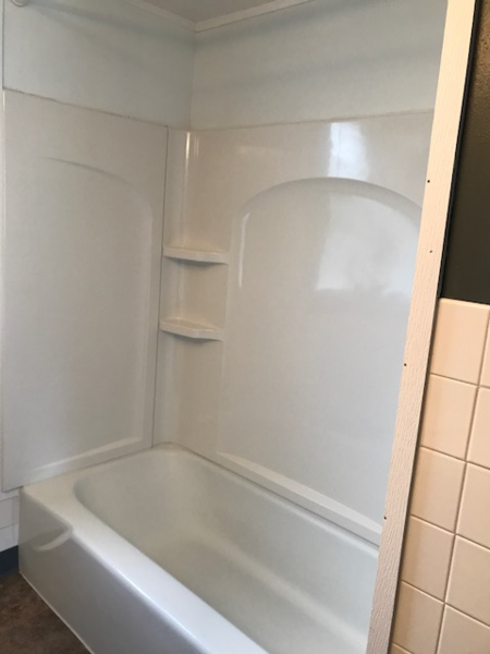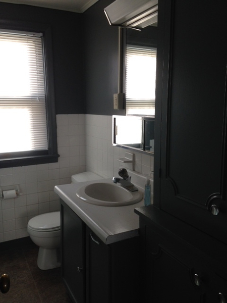 Full Bath with tub & shower; lots of storage; painted gray; linoleum flooring
