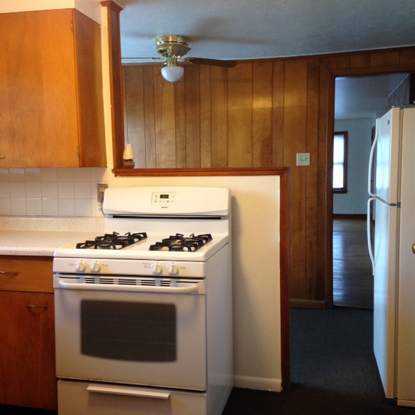 Kitchen includes a refrigerator, gas stove, ceiling fan and lots of cupboards; one closet; walls painted white